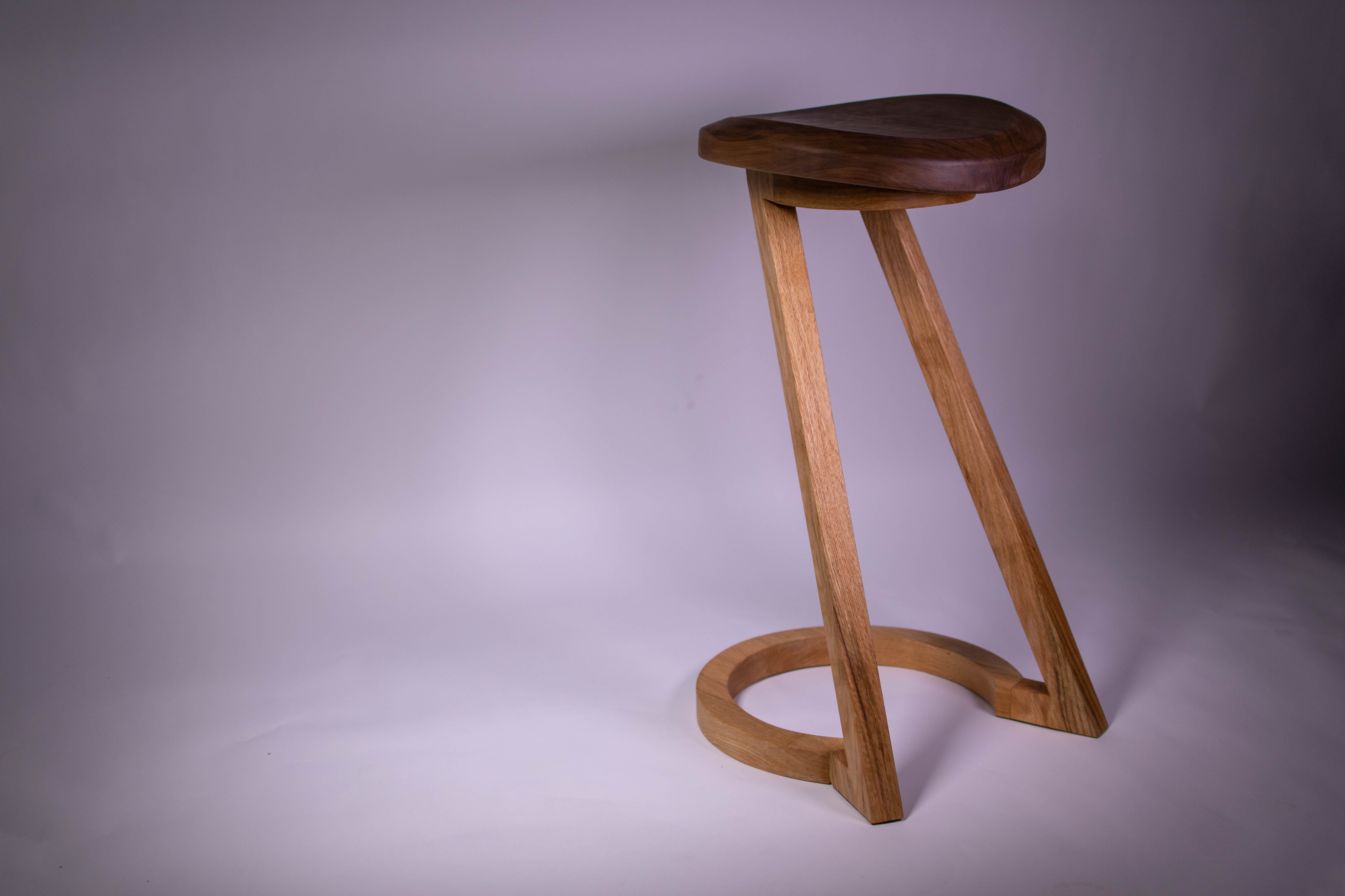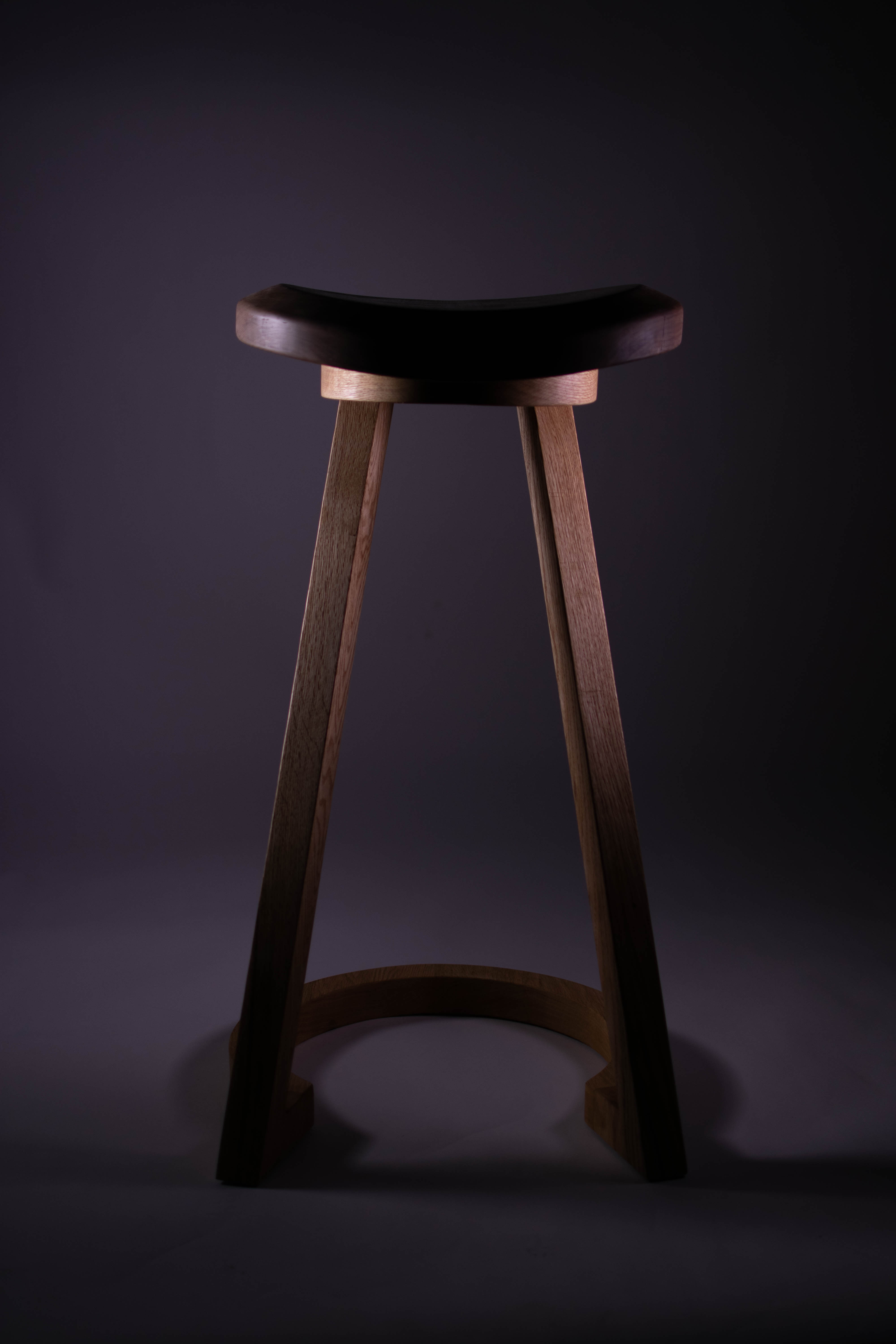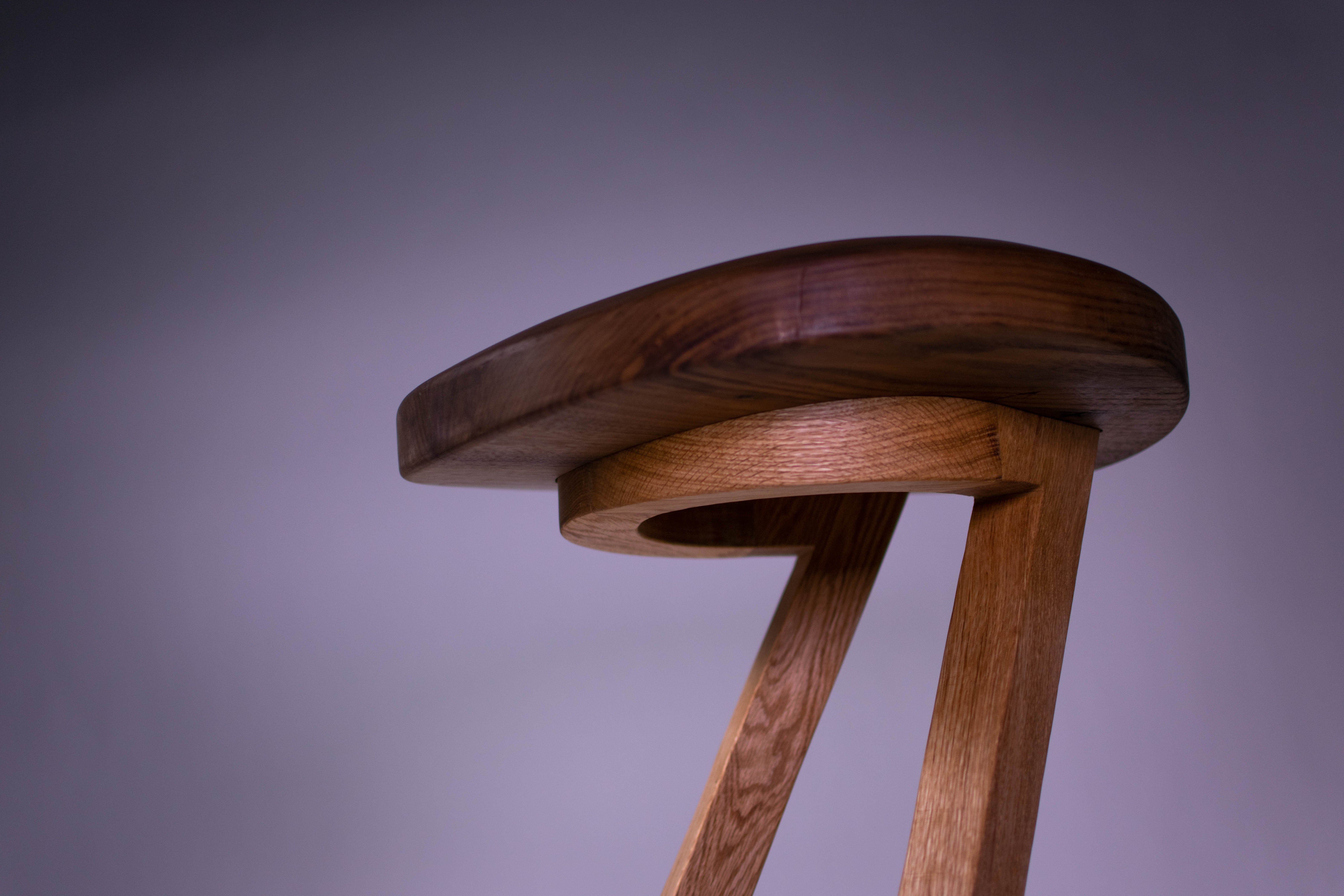 The legs are made from red oak, while the seat is walnut. The base is reinforced with a custom metal bracket.